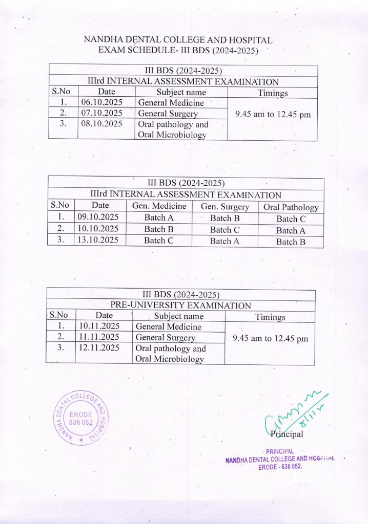 Upcoming II BDS & III BDS 1st Internal exams will be starting on 18th December 2025. Schedule will be uploaded