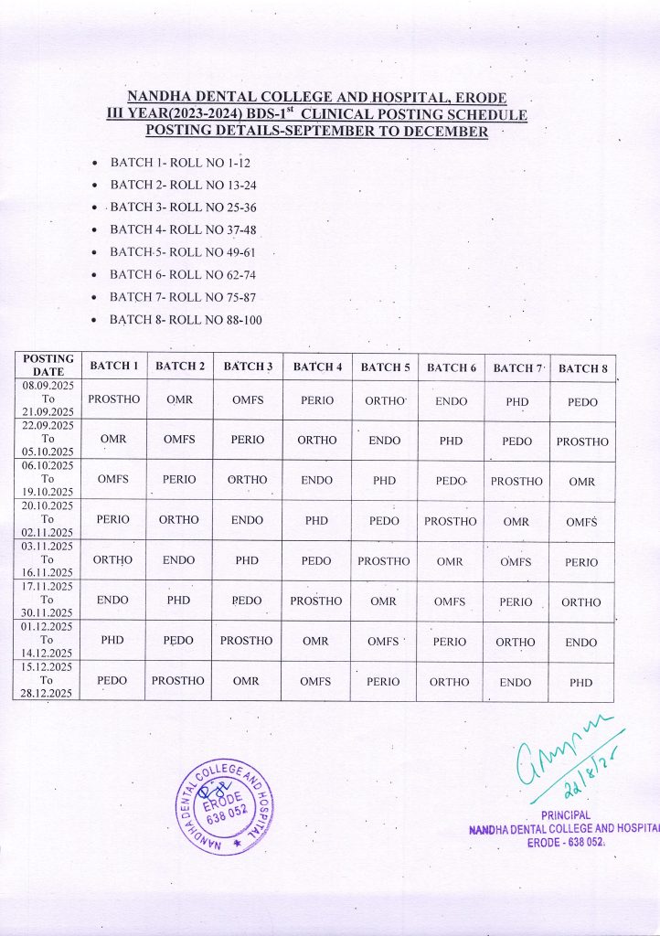 Clinical posting schedule for the academic year 2025 – 26 is as follows. Students kindly make note and prepare for postings accordingly.