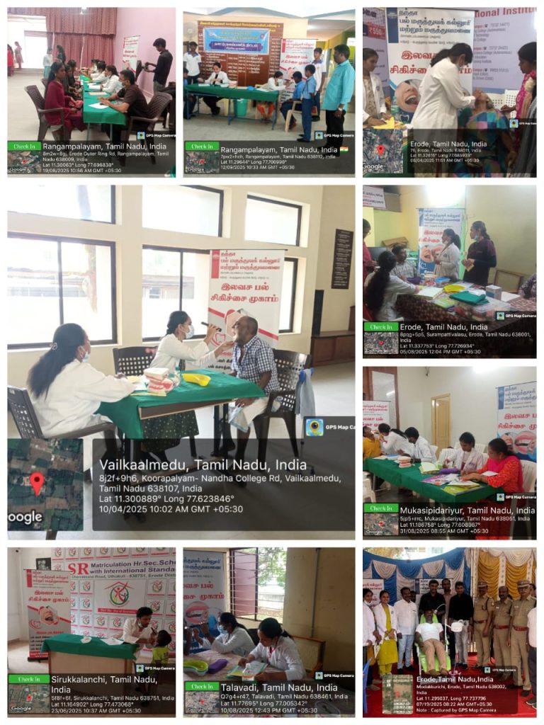 Nandha Dental College conducts Dental Camps in the surrounding areas for improving dental awareness about importance of dental health and to treat their dental diseases. The camps was conducted for general public
